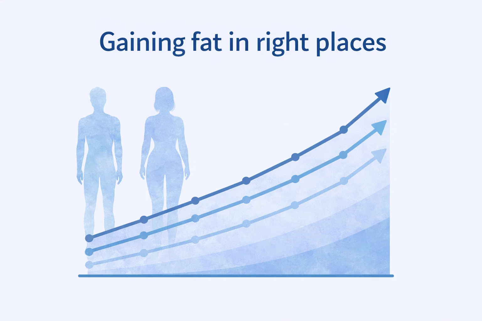 You want to gain weight in the “right places”. Generally as a man, this means gaining muscle (which will be discussed separately), and as a woman this means gaining both fat and muscle. I will discuss here for women on how to try to gain desirable fat deposits (hips, thighs, buttocks, breasts) rather than in undesirable places (abdomen, back, chin, arms).