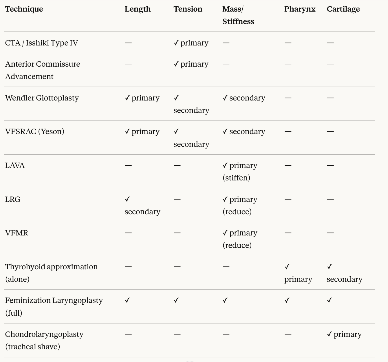 Tracheal shave is the first kind, and is purely cosmetic. A properly done “chondrolaryngoplasty” is meant to be voice-neutral. But overaggressive reduction can destabilize how some things attach, and cause voice problems like lowered pitch or dysphonia